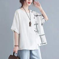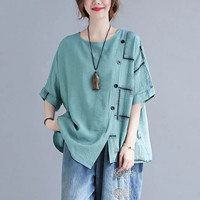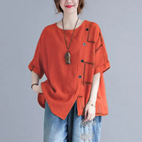 夏季新款棉麻寬鬆短袖 A字版型藏住拜拜肉 圓領修飾脖頸 斜扣視覺顯瘦 不挑年齡不挑身材